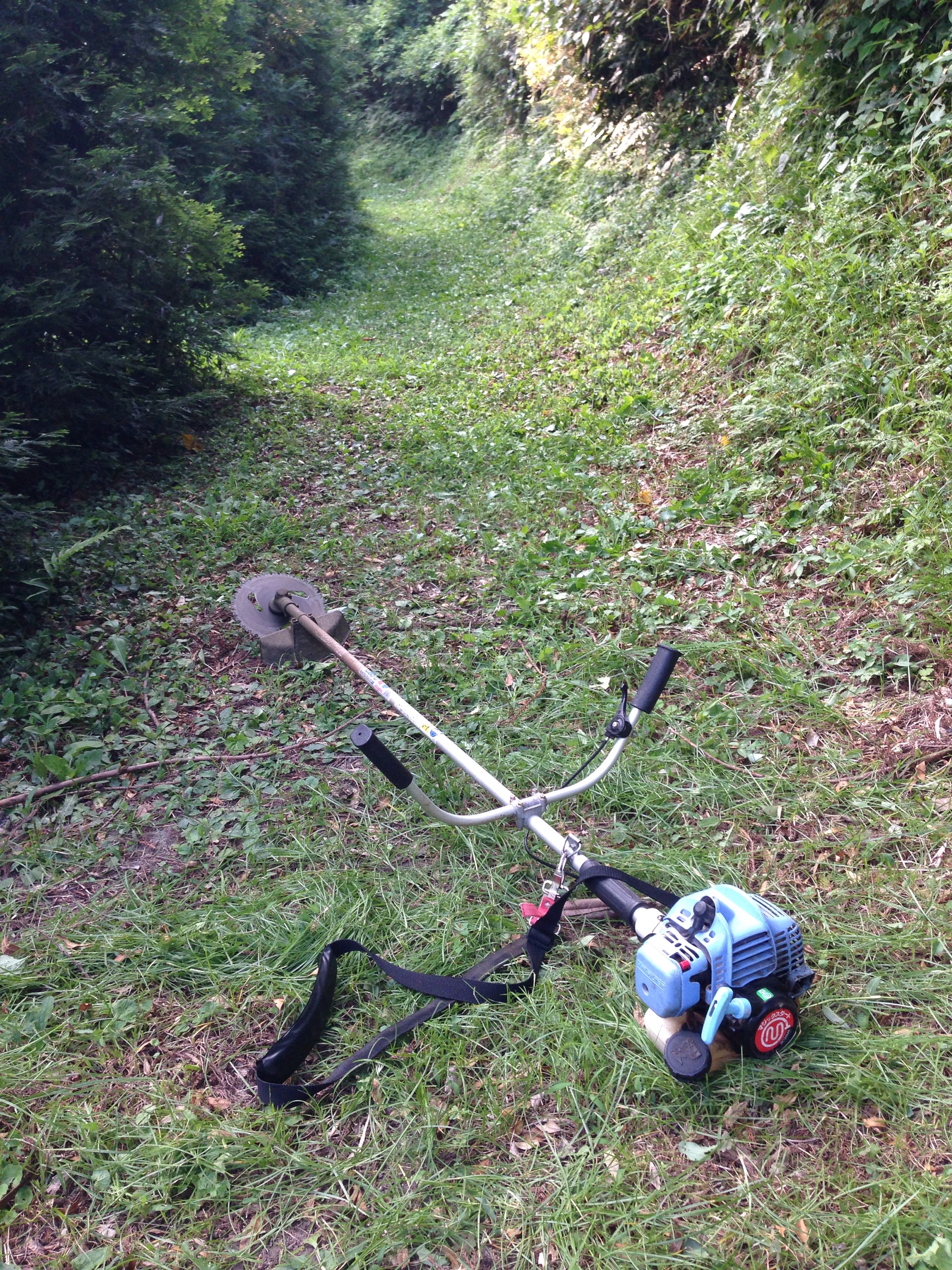 実は大学時代、バイトで高速道路の中央分離帯や夜間の飛行場などの草刈りをやったことがあり、この機械、初めてではなかったのですが、慣れないせいか、刈った跡が綺麗にならず、ムラだらけの坊主頭と言った感じ。そのうち、板に着くかな。