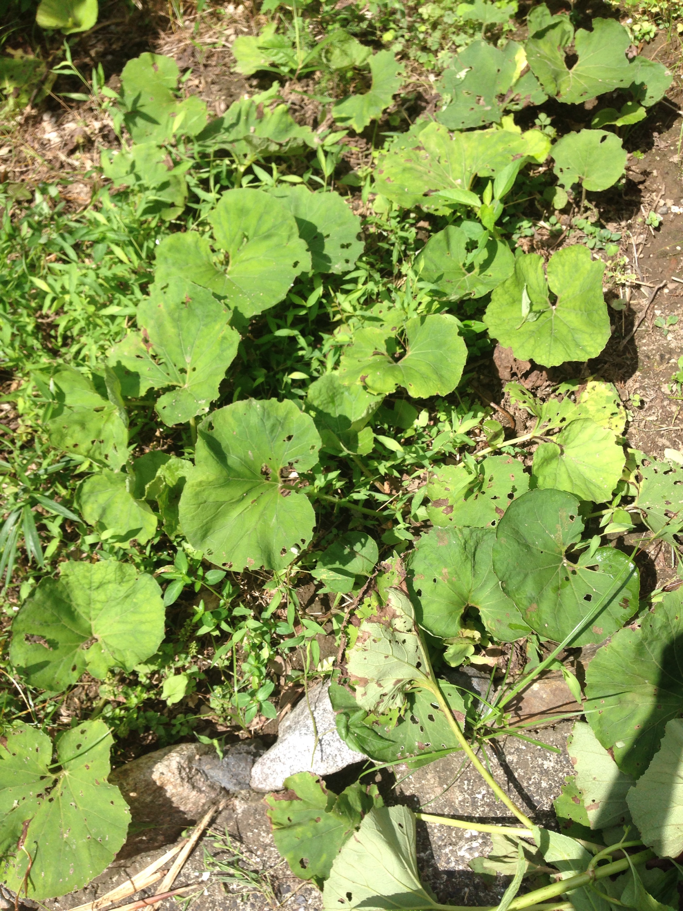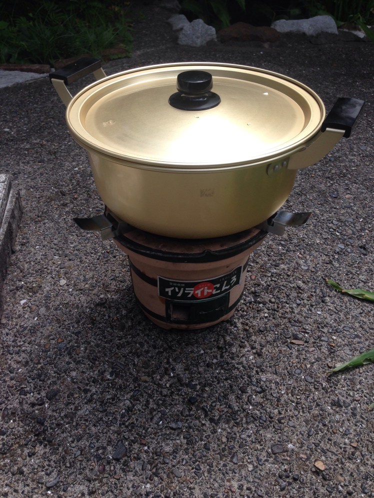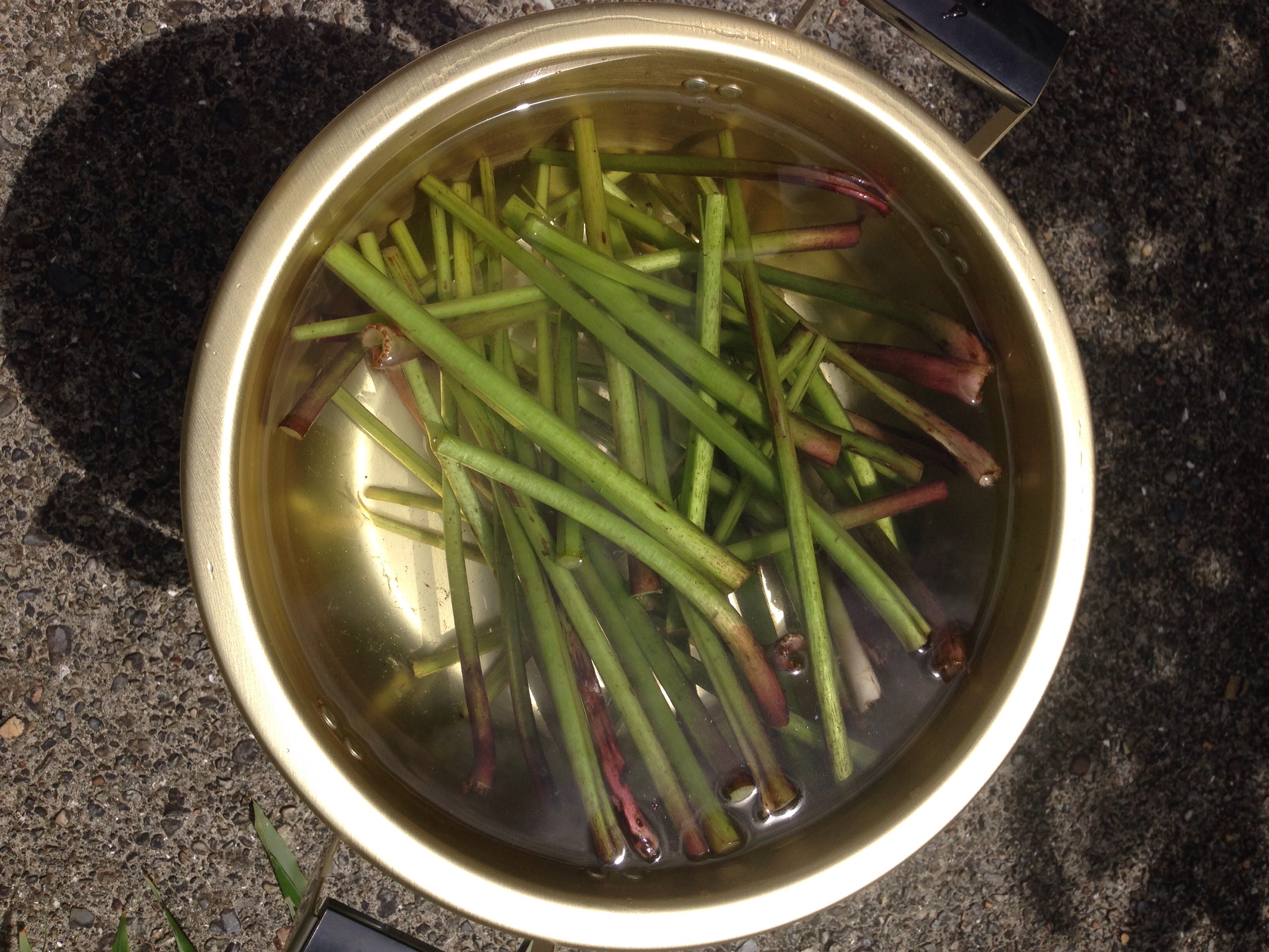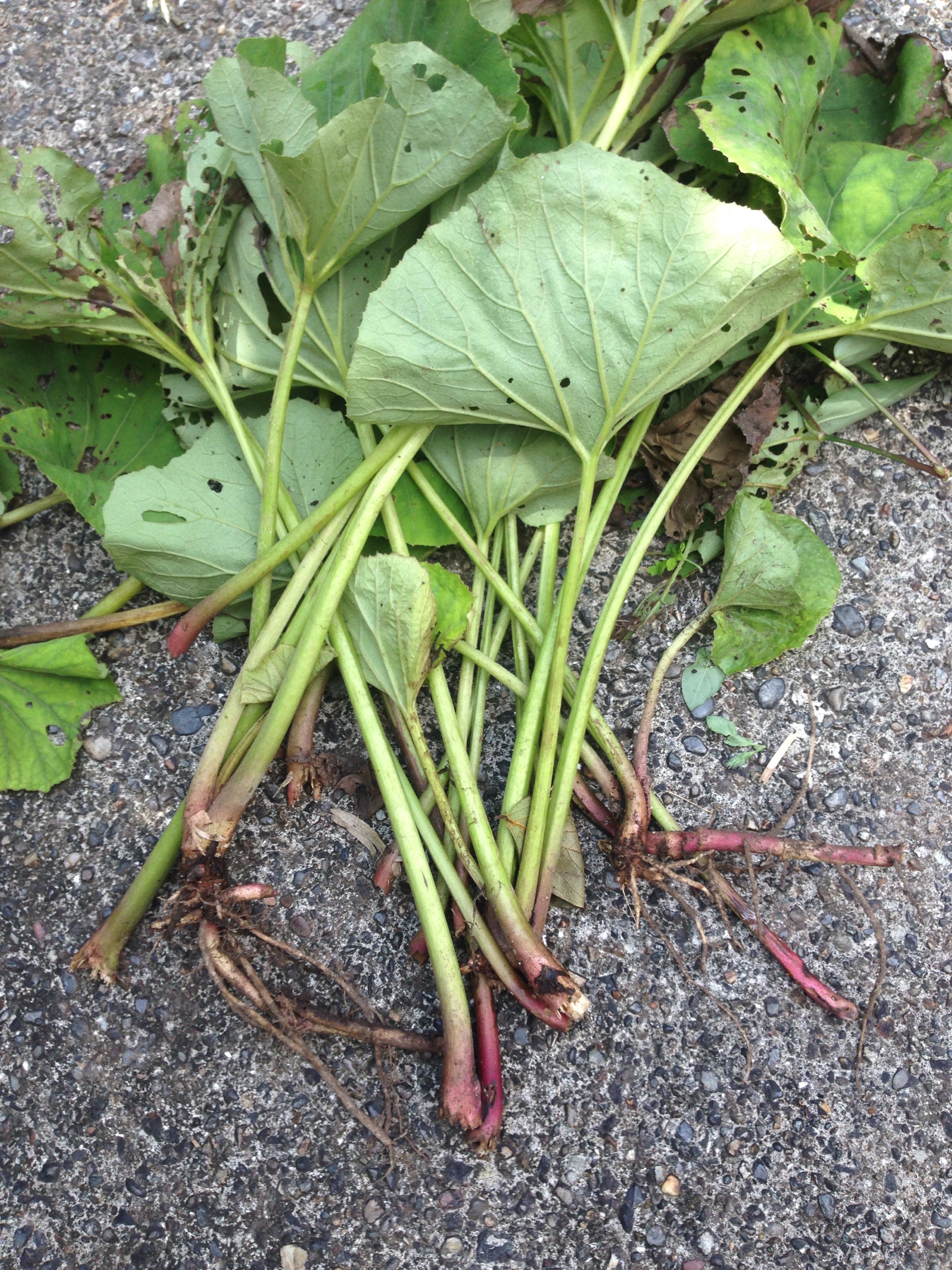 私も農作業用の身支度(ジーンズに長袖のTシャツ、それに長靴)をして、にわの木々の手入れを。長く伸びすぎた木の枝や昨日とは別の場所のミョウガ採り。それからフキも沢山あるので、子供の頃の記憶を頼りに、切ったフキを大きな鍋で炊いてアク取り。