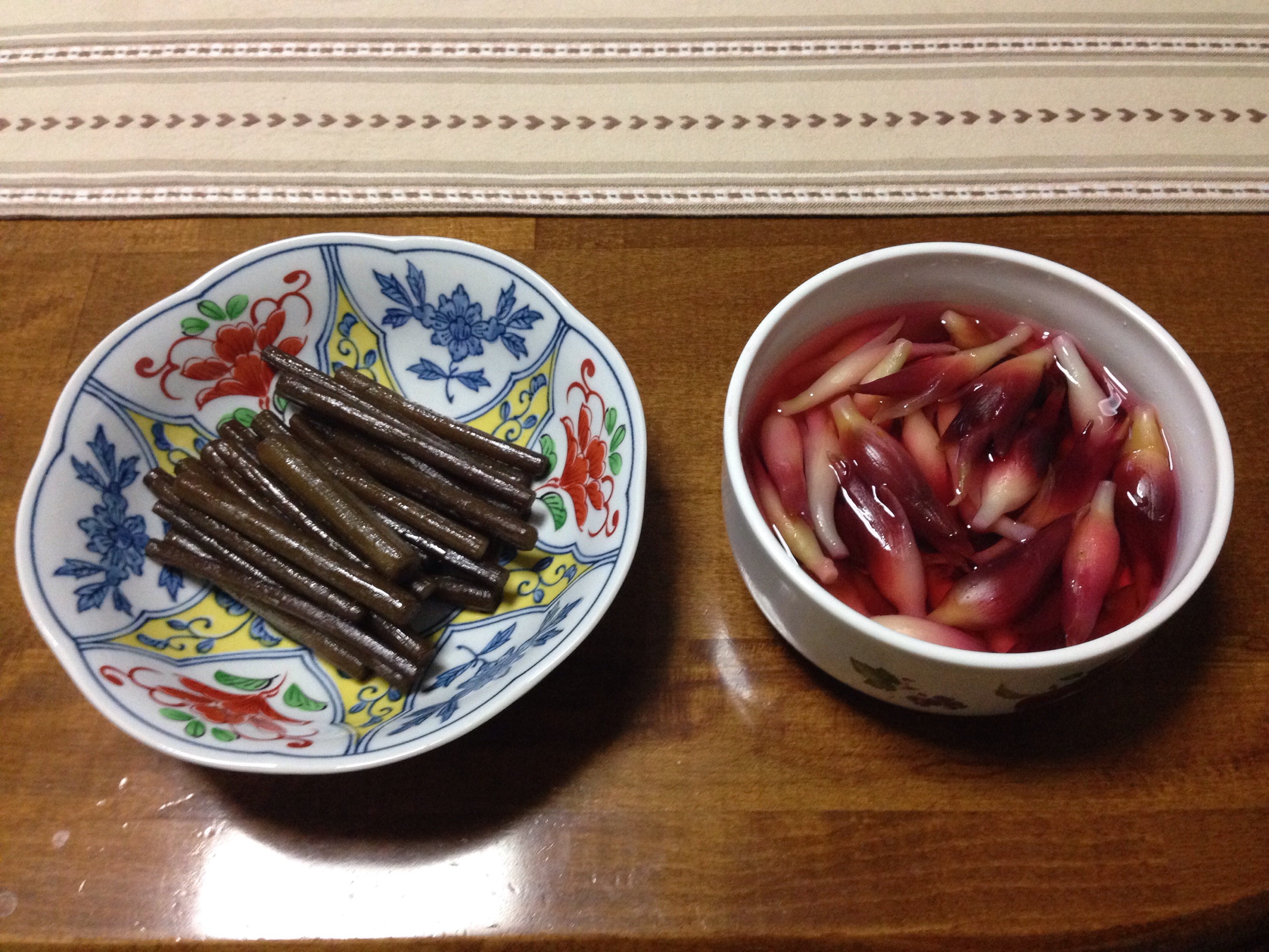 一茹でした状態で横浜の家に持ち帰り、皮むき。この作業が超大変でした!ただ、アクがまだ抜け切らない感じだったので、重曹も使ってもう2度ほどあく抜きを繰り返し、その後、醤油、砂糖、塩少々で煮込んで最後に胡麻油で炒めたのが出来上がり(写真、右は昨日甘酢に漬けたミョウガ)です。男料理、自分の勘で作っているので見栄えはイマイチですが、柔らかく、苦味もなく美味しく仕上がりました。