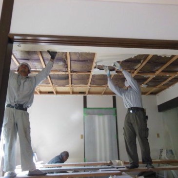 今週、工事が始まっています。まずは内部の解体工事。メインは天井板の剥がし作業です。 ダイニングの上は2階があり天井の化粧板を剥がしてもフラット。梁が綺麗に並んでいます。 このダイニングと奥のリビングを仕切る下がり壁、何と … 続きを読む : リノベーション その6