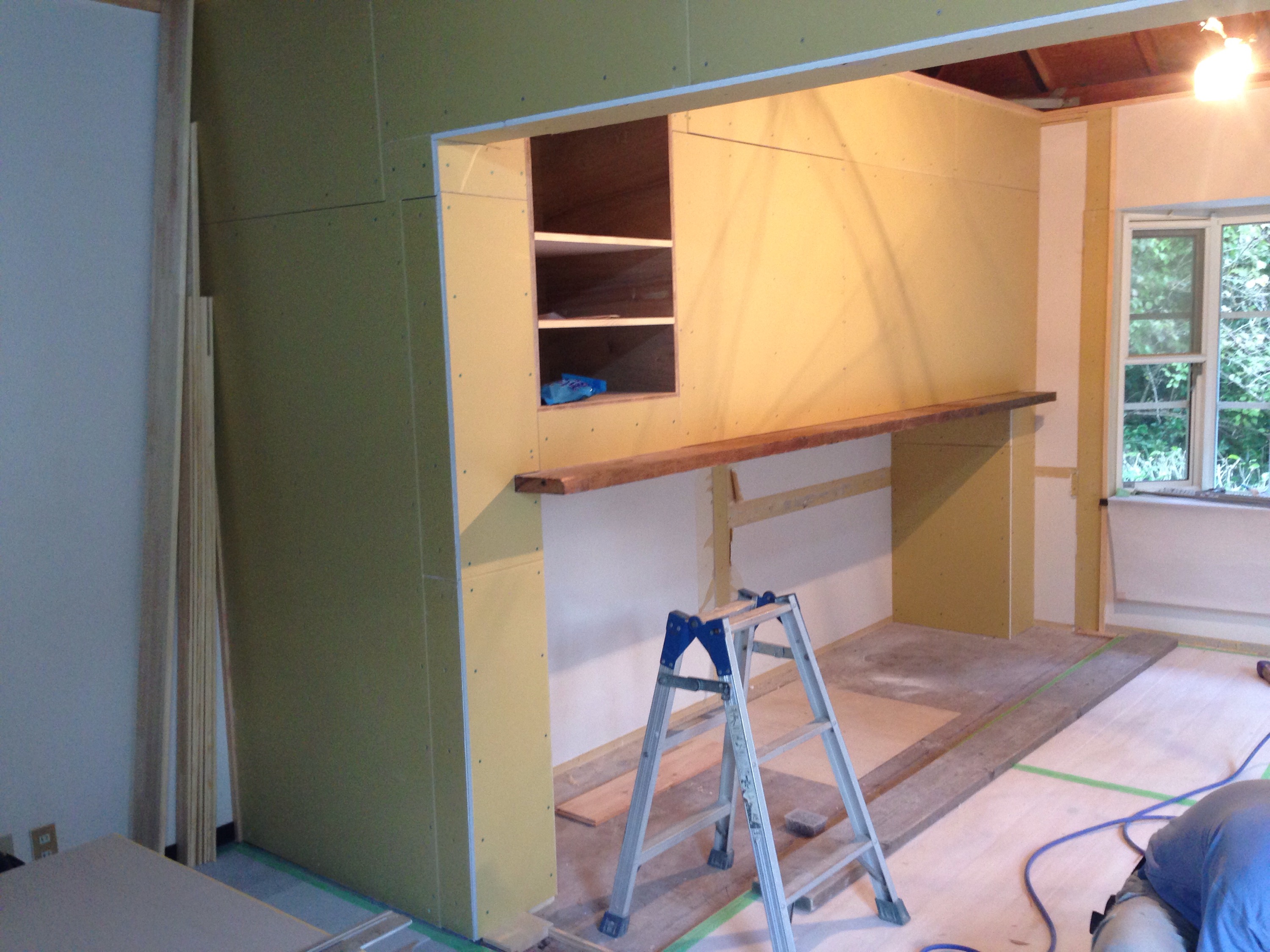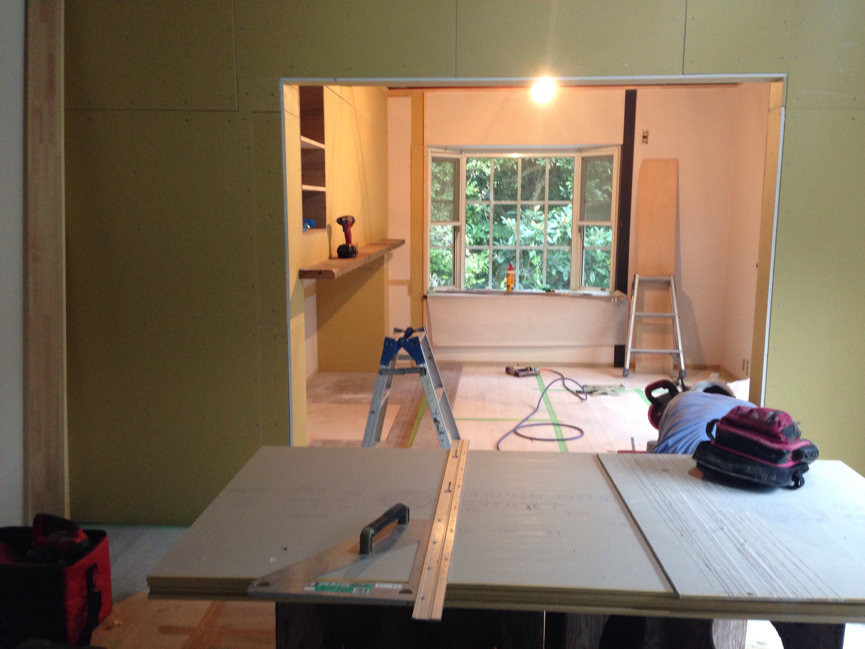 着くと、既に大工さんが来て内装工事の作業中。今回工事のポイントになるダイニングとリビングの空間の一体化を阻む左右の両袖壁と天井からの下り壁。施工側は荷重が掛かっているのでどれも取れないとの主張が続いてましたが、ここは譲れないところとデザイナーと代替案を作って、下り壁は取れないものの、左袖壁はその分構造補強することで削ることを実現、結果、リビングの暖炉上のメインの壁(写真左側)がダイニング側からすっきり見えるようになり何とか一体感が出てホッとしました。