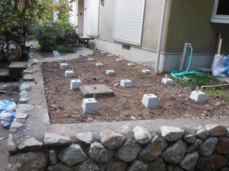 ウッドデッキも基礎工事が終わり除草シートも張られていよいよデッキ本体の工事に移ります。
