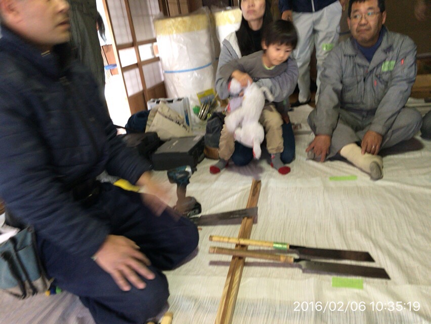 最初は工具の基本的使い方から。メジャー一つとっても先端が引っ掛けた時と押し付けた時で、ちゃんと引っ掛かる部分の金属の厚さが誤差とならないよう、1mm程度ずれるように可動域があるとか、インパクトと言う超有用な工具の使い方、手鋸の選び方など、とても為になりました。