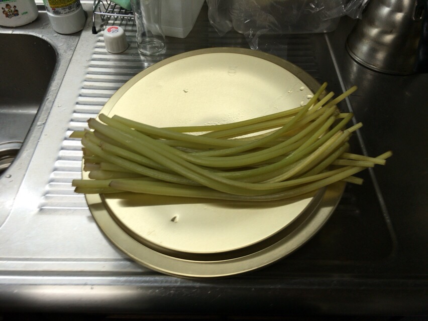 今朝起きて雨上がりの庭に出ると隣の畑に人影が。降りて行くとご夫婦でフキの収穫をされていました。長さを整えて出荷されるとのこと。今が旬なのですね。我が家の敷地に生えるフキもいい感じに大きくなって2週間前より柔らかそうに見え、こちらも収穫して、また頂きました。アク抜き、皮むきも大分慣れてそれ程手間ではなくなってきました。写真は皮むき完了したものです。