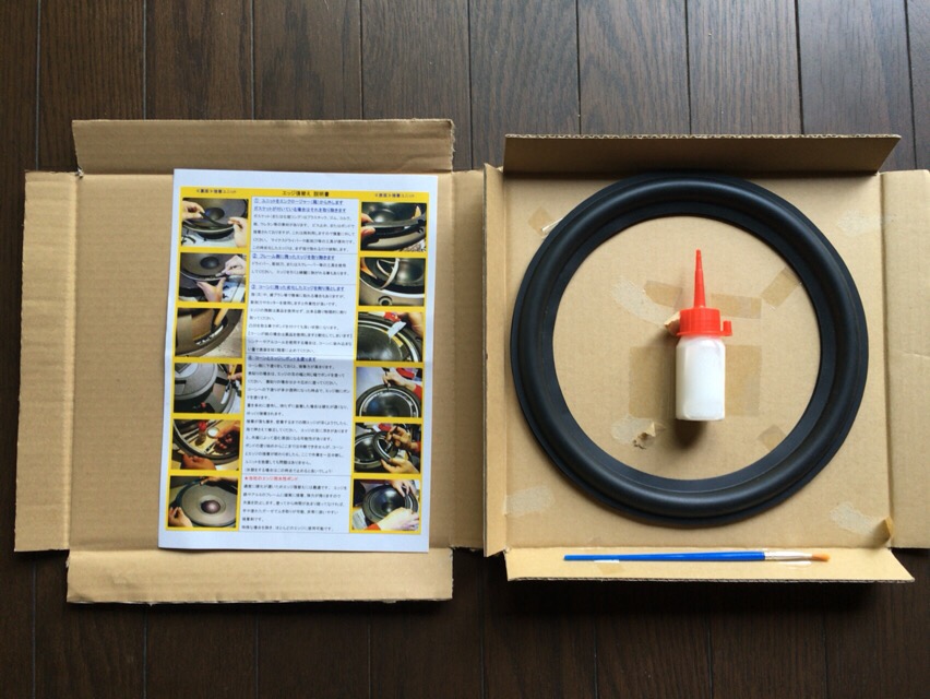 取り寄せたエッジと接着剤先ずはスピーカーを筐体から外し、古いエッジ部分を完全に取り除きます。この作業が結構大変でした。