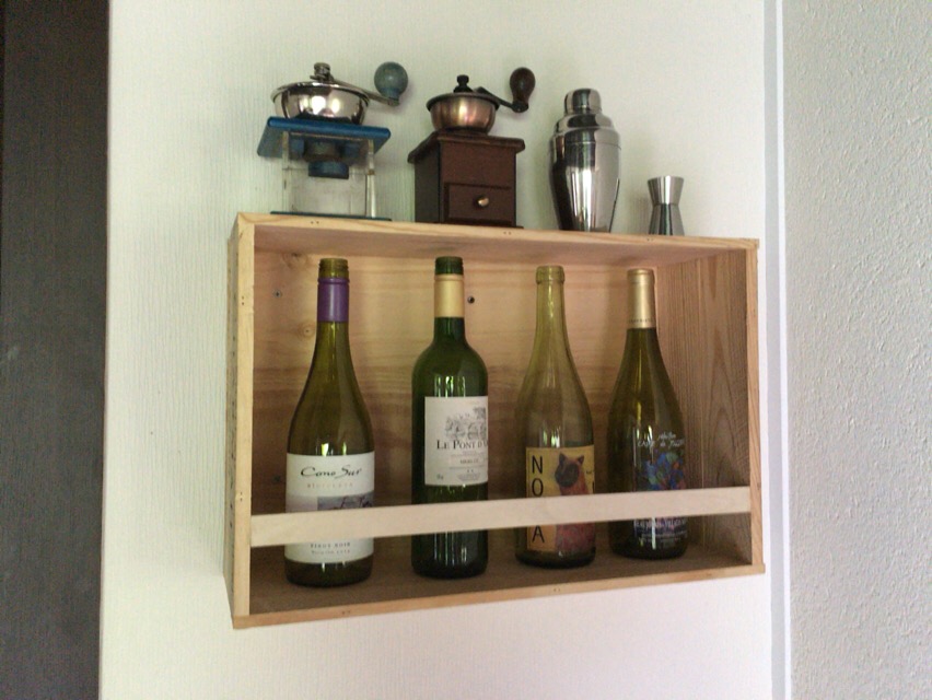 まずは、友人経由で譲って貰ったワインの木箱、お酒用の棚にするため、壁に取り付け。壁が石膏ボードのみの部分は強度補助のため買ってあったアンカーを下に打ち込み。始めたら15分ほどで完了。