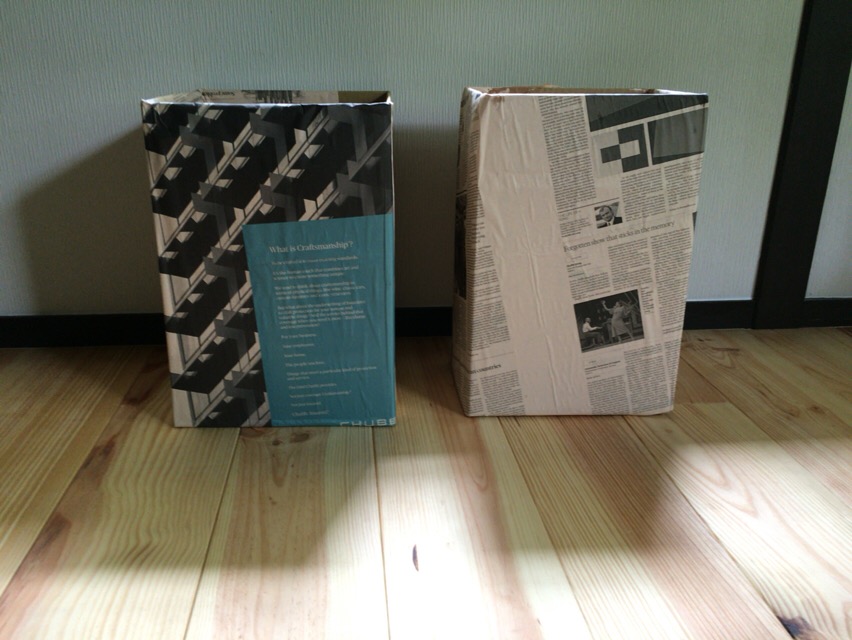 他にダンボールのゴミ箱に英字新聞張り。この家、なるべく物を増やしたくないので、ゴミ箱はダンボールを利用しています。