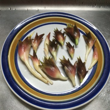 昨年、随分お世話になったミョウガ。今年も柿の木の下に十分に茂ってきたので茎を一本抜いてみると実が。帰り際で時間が無かったので茎をかき分けて10個くらい採って帰りました。 今年もこれから沢山お世話になりそうです。
