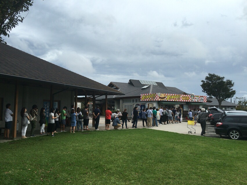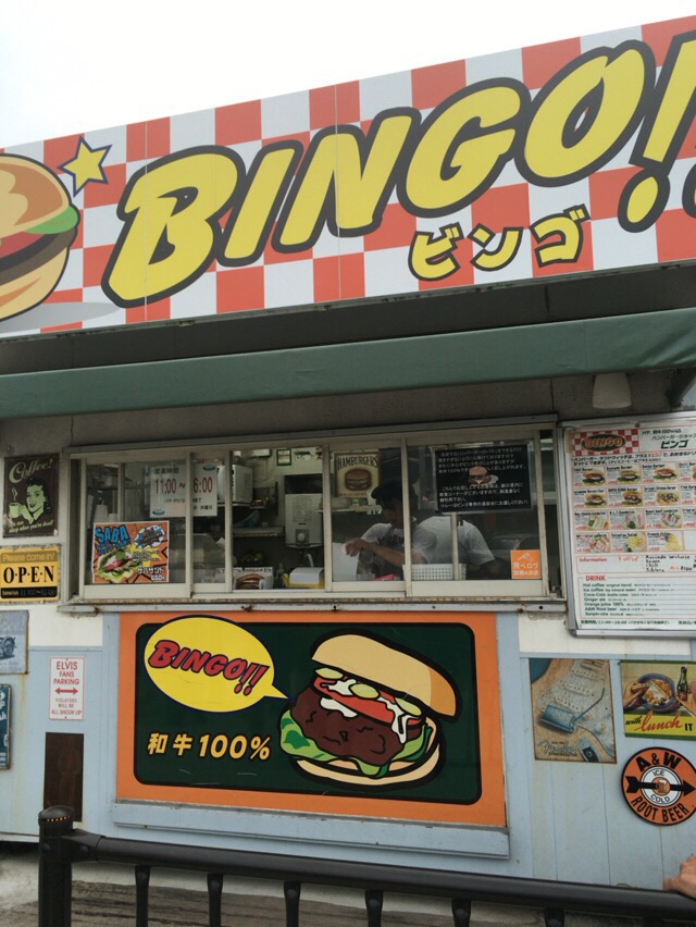 私が朝、自転車に行き、戻ってからだったため朝食が遅くなり、ランチにとレインボーグリルに向かったのは14時過ぎ。お店の基本情報には17時までと書いてあったので余裕だなと何の心配もしていませんでした。ところが、さあ着いたと玄関に行くと“Closed”の札が。。「パテがなくなり次第営業は終了します」と。仕方ないと、気を取り直して「もう一軒、有名なとこがあるよ」とローカル情報に詳しくなったお父さんは早速次のハンバーガー屋さんへ車を走らせました。三芳の道の駅にある「Bingo」です。着いてみると、あちゃっ。凄い行列。