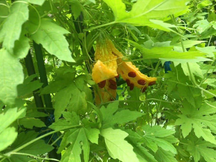実が熟れるとこんな風に黄色くなり、中から赤い実が。これは種でしょうか?ネットで調べたら黄色くなったゴーヤは苦味がなくなり赤い実は種で甘いと書いてる人がいました。ちょっと食べる勇気がありませんが。