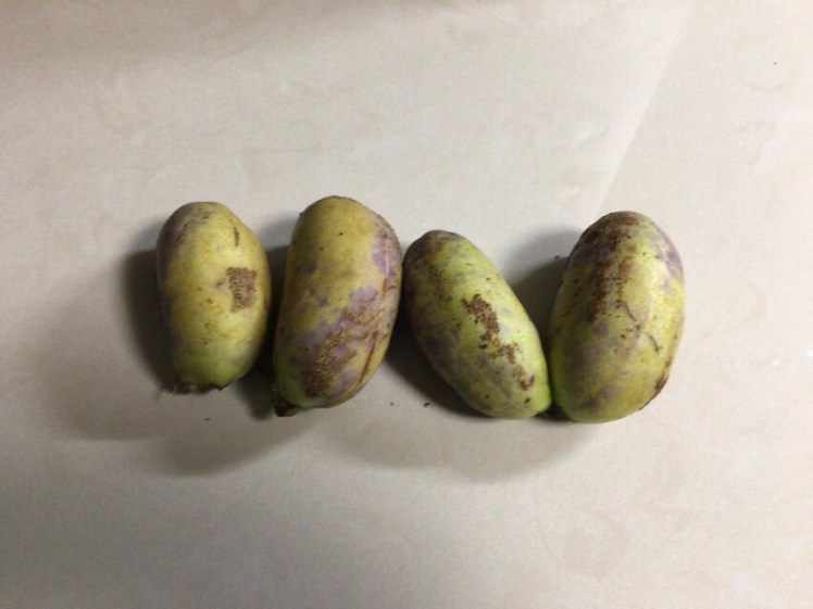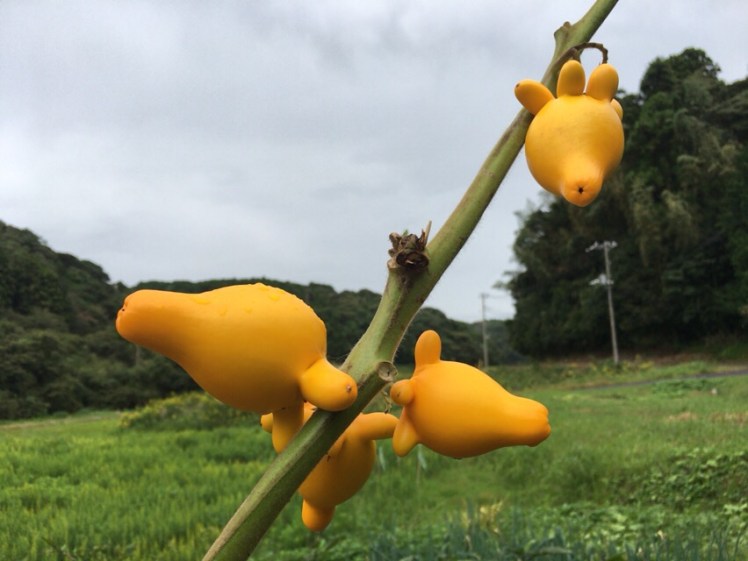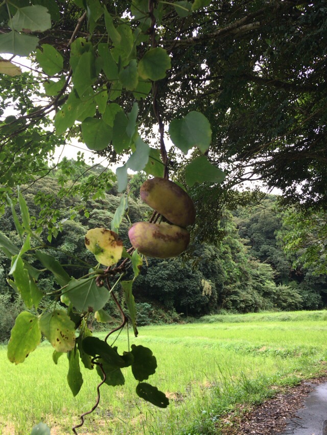 しばらく歩いているとアケビの蔓が道の脇から伸びて実がなっているのを発見。