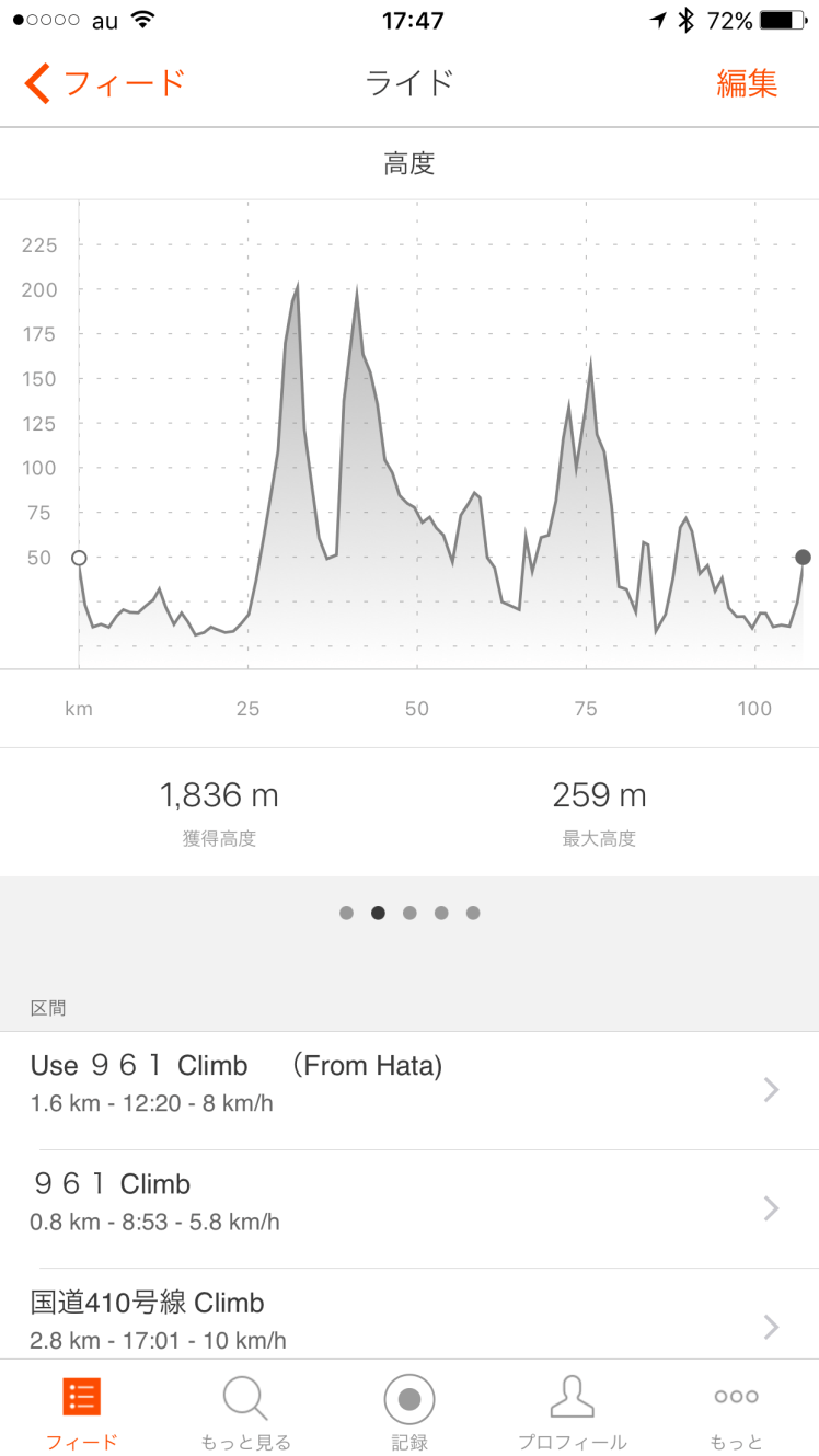 今日の総距離は107km、走行時間4時間47分、そして、獲得標高差は1836m、かなり登った感があります(下のグラフが高度の推移です)。この2日合計で200km。良く走りました。