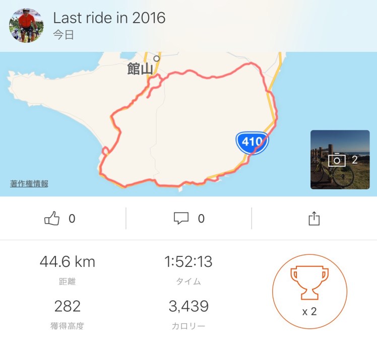 Last ride in 2016 投稿日: 2016年12月30日 投稿者: Hiroaki Fujii 今日で今年の自転車は終わり。昨日、今日と短いながら最近蓄積気味の脂肪を年内に出来るだけ落として年を越そうと乗りました。今日は白浜の海岸線を回る約45km。これで今年1年間の総距離が4714kmとなりました。目標としていた5000kmは達成出来なかったものの、事故もなく良く乗りました。来年も事故なくエンジョイ出来ますように。 共有: Facebook で共有するにはクリックしてください (新しいウィンドウで開きます) Facebook いいね 読み込み中…