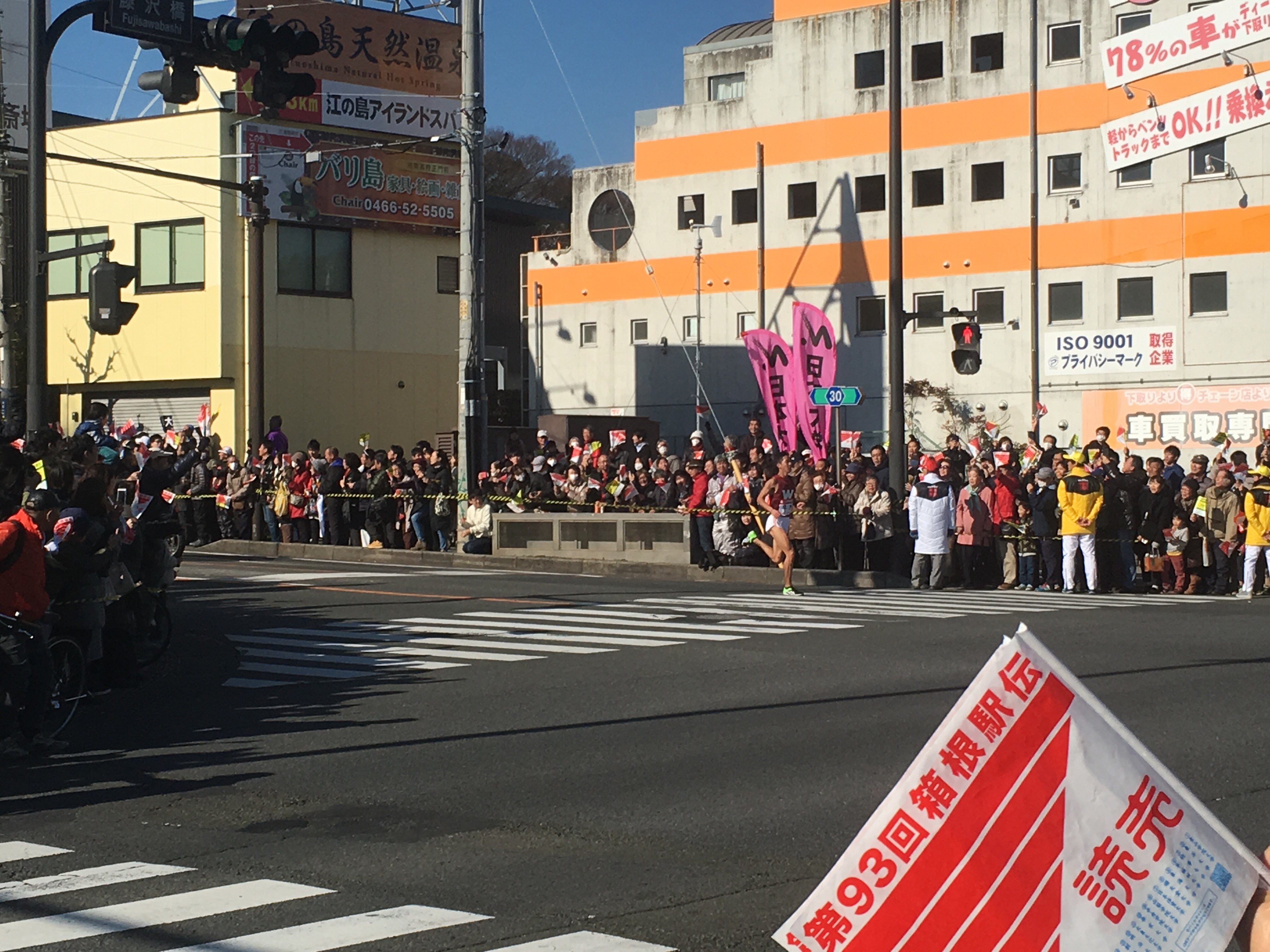 途中、藤沢橋の交差点で箱根駅伝の選手を応援。