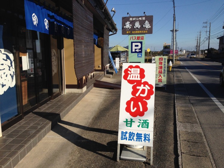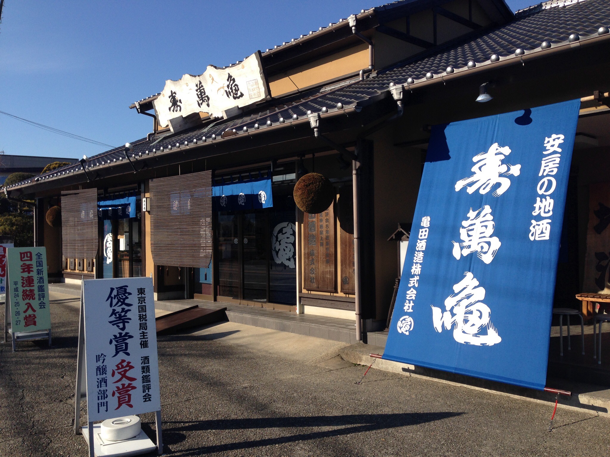 先日、バイクで外房の鴨川から内房の保田に抜ける長狭街道の途中、無料の甘酒をいただける、街道沿いの酒蔵に立ち寄りました。亀田酒造が造る地酒「寿萬亀」の本店です。