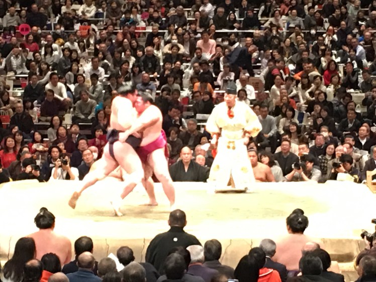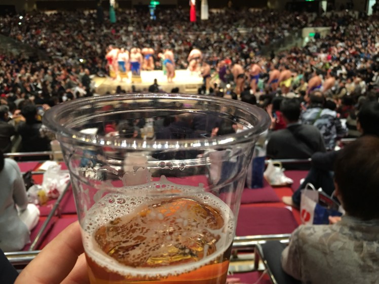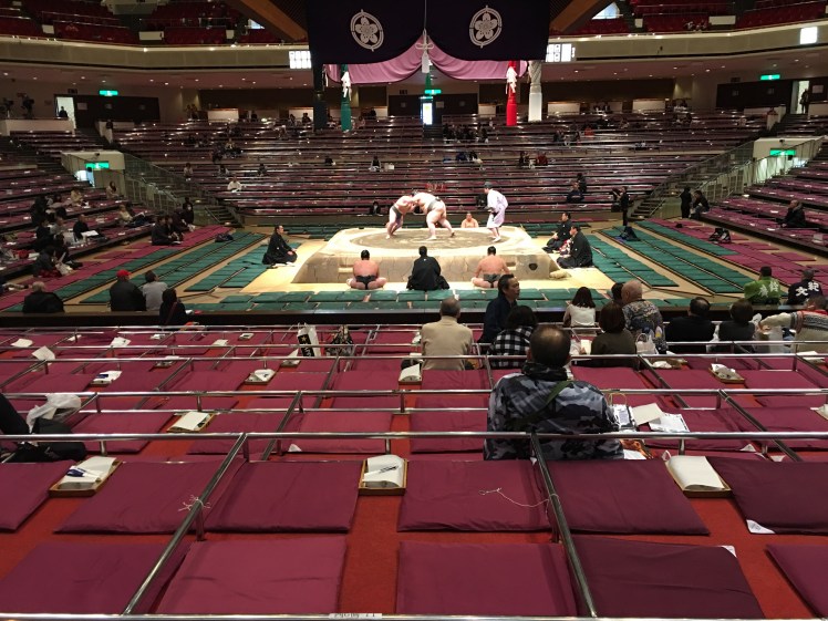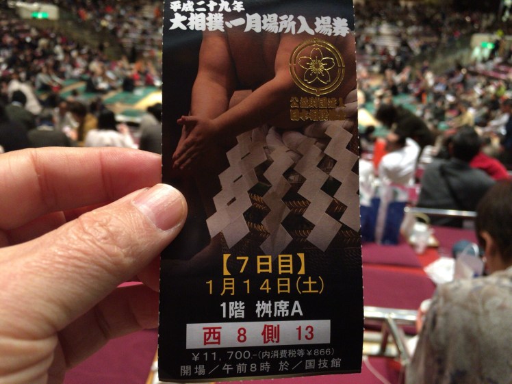 今日は月末のフルマラソンに向け朝10km走った後、人生初めての相撲観戦のため、家族で両国ヘ。幸運にもある方から升席のチケットを頂きました。