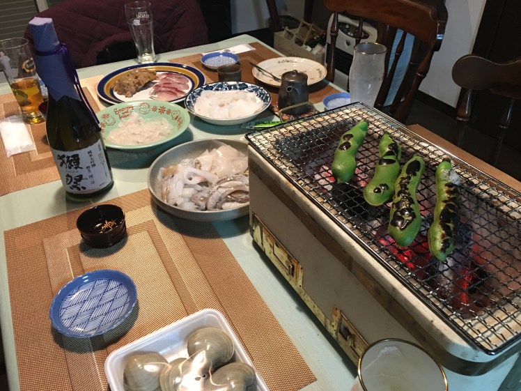 夕方5時に館山駅に集合して先ずは買い出し。一人は太公望で魚をさばけると言うので、地元産の新鮮なアジ、カワハギ、イカなどを購入。アジはナメロウと刺身に、カワハギは刺身にして肝をまぶして、イカは刺身と海鮮焼きにして頂きました。