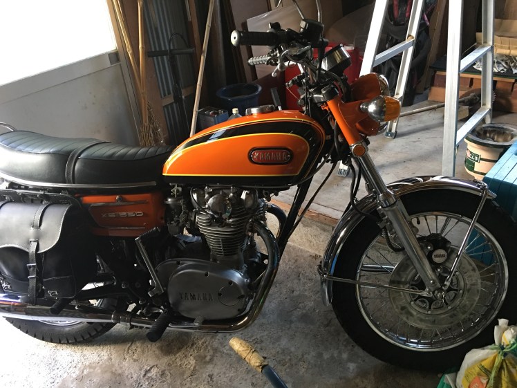 この週末は高校時代の友人が訪ねてきました。一人は電車で、もう一人は昭和46年製の中古を買って自分でパーツを買い集めてピカピカに再現したと言うカッコいいバイクできました。
