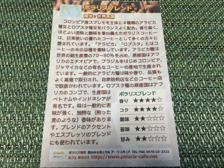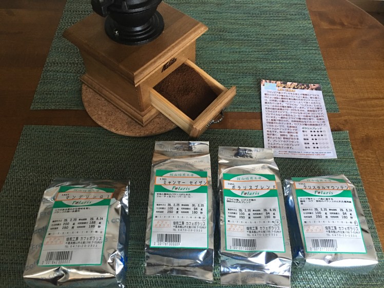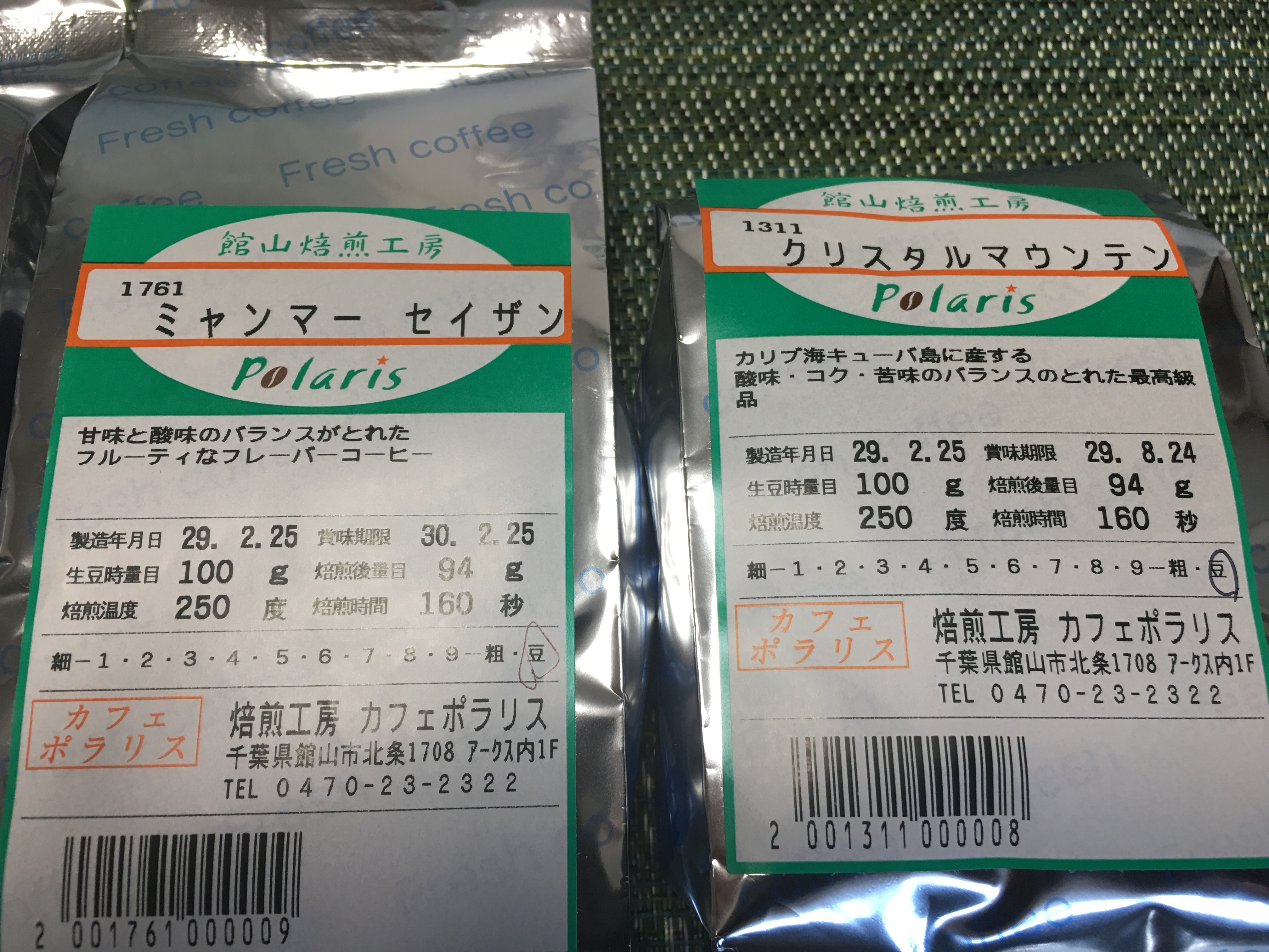 お店には世界中から取り寄せた色んな種類のコーヒーの生豆があり、好きな豆を選んでグラム数と好みの焙煎の度合を指定するとその場で焙煎してくれます。焙煎している間、コーヒーを一杯サービスしてくれます。そんなポラリスさんですが、先日、ちょっとしたハプニングがありました。いつものように豆を2種類、100gずつ頼んでコーヒーを頂き、焙煎仕上がった豆を受け取って車で横浜に向かったのですが、館山道に乗る手前で家内から電話があり、先ほどのコーヒー豆、間違った種類の豆を渡してしまったとしきりに申し訳ないと自宅に電話があったと。もう、高速に乗る所だったので、その日はそのまま帰ってきたのですが、その後直ぐに頼んだ豆とポラリスのオリジナルブレンドの豆が家に送られてきました。私はいろんな種類を楽しむのが好きで特に特定の豆に拘りはなく、しかも間違えた豆は200gと量も2倍でもあったので(笑)、わざわざそこまでしてくれなくても良かったのですが嬉しい対応でした。