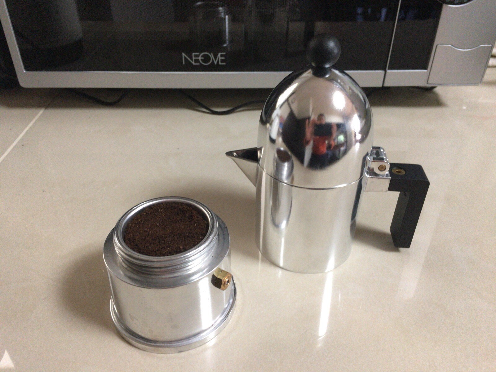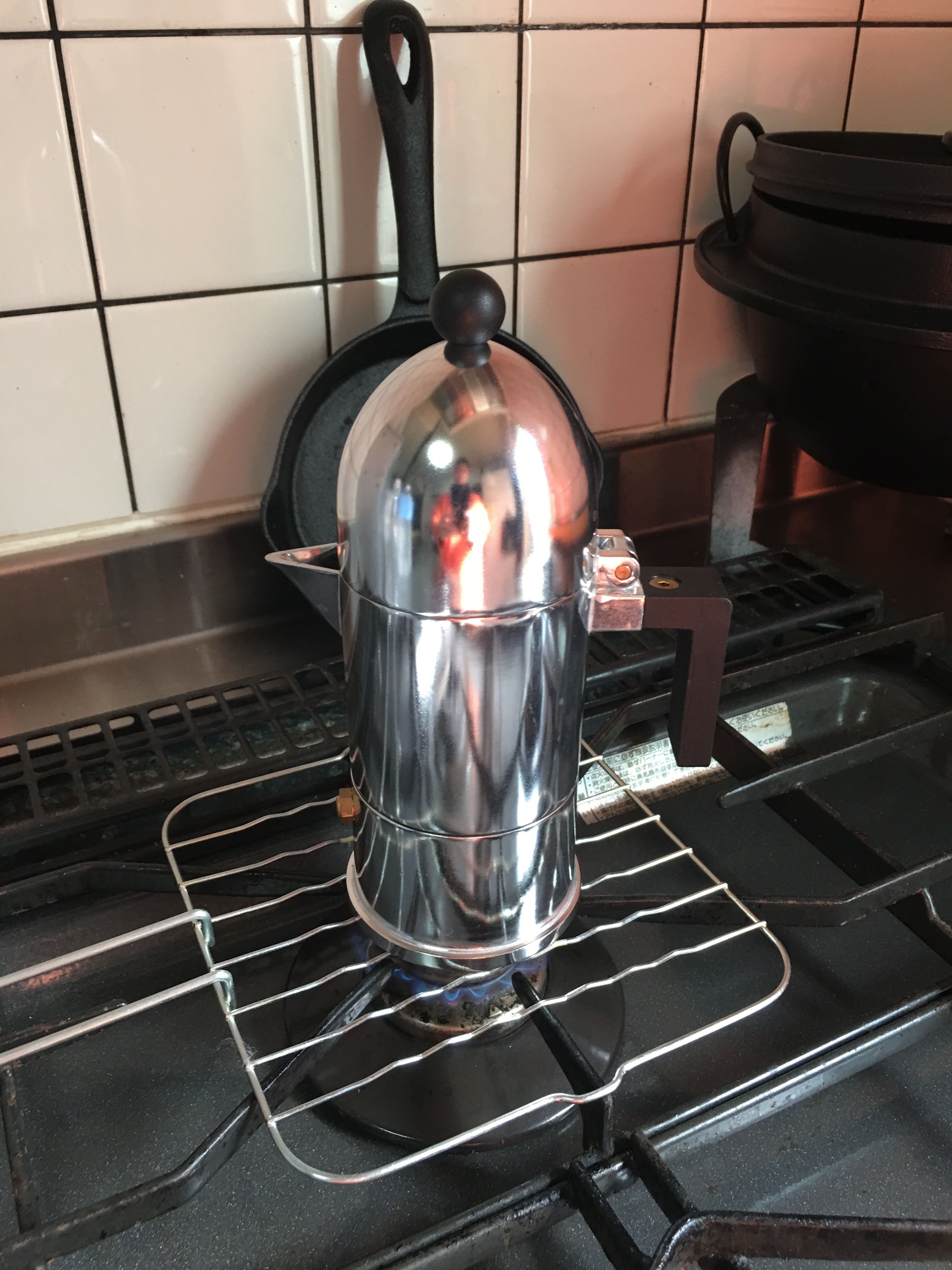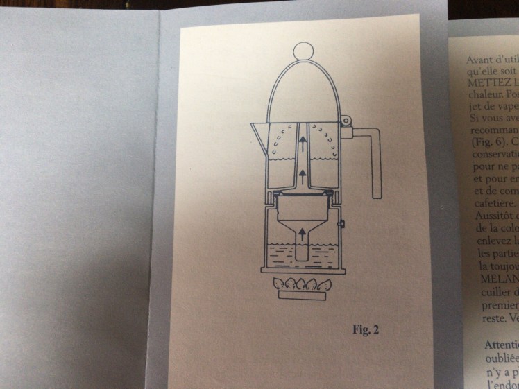 ねじ式になっている上部容器をかぶせ、火にかけて沸騰させ、抽出されるエスプレッソが下部から中央のパイプ部分を抜けて上部に上がり容器に溜まって出来上がり。