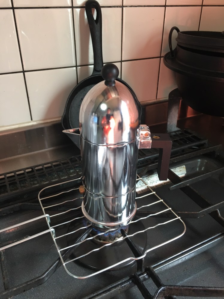 エスプレッソってどうやって作るんだろう?以前より、その仕組みを知りたいと思っていて、最近はオシャレで便利な全自動型のエスプレッソマシーンも多数出ていますが、原始的な仕組みで作る直火式エスプレッソメーカーを購入してみました。抽出の仕組みはこの図の通り。