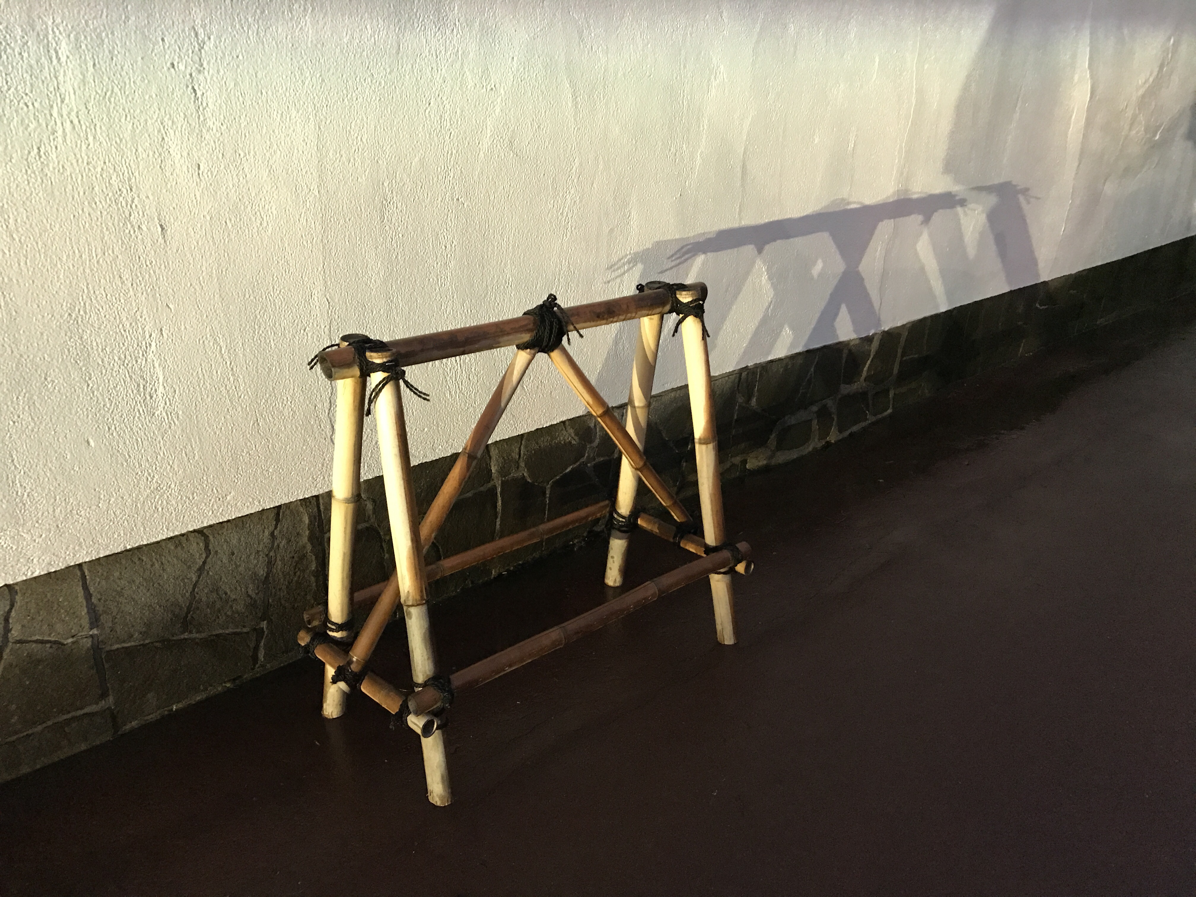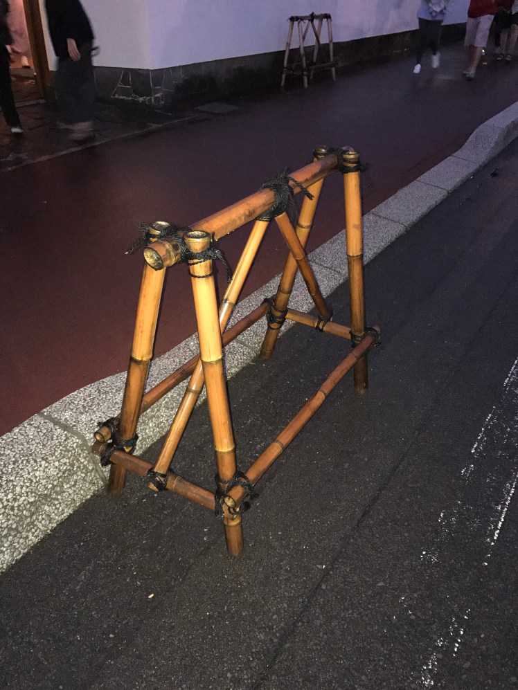 帰り、店前に置かれている竹製の駐車防御柵を発見。カラーコーンじゃ風情台無し。こう言う拘りがあってお店も長続きするんですね。