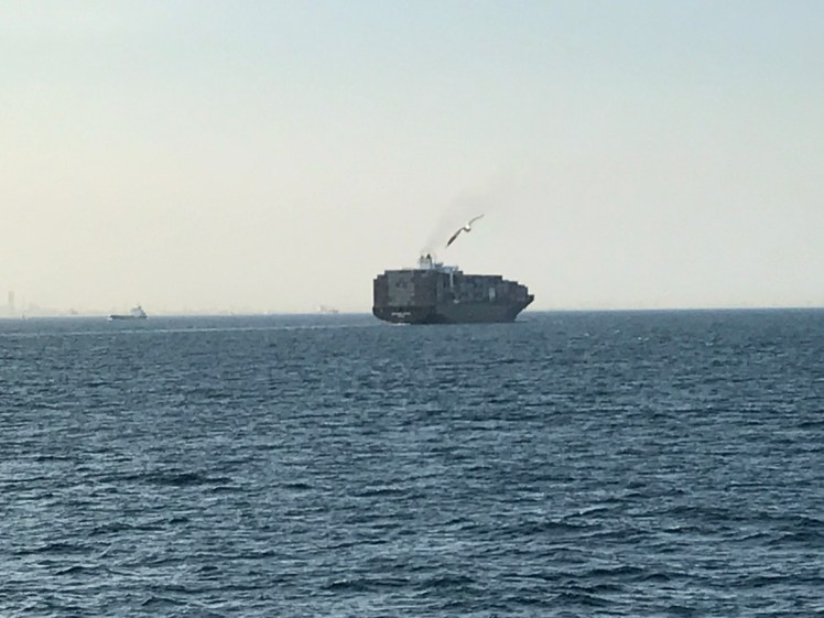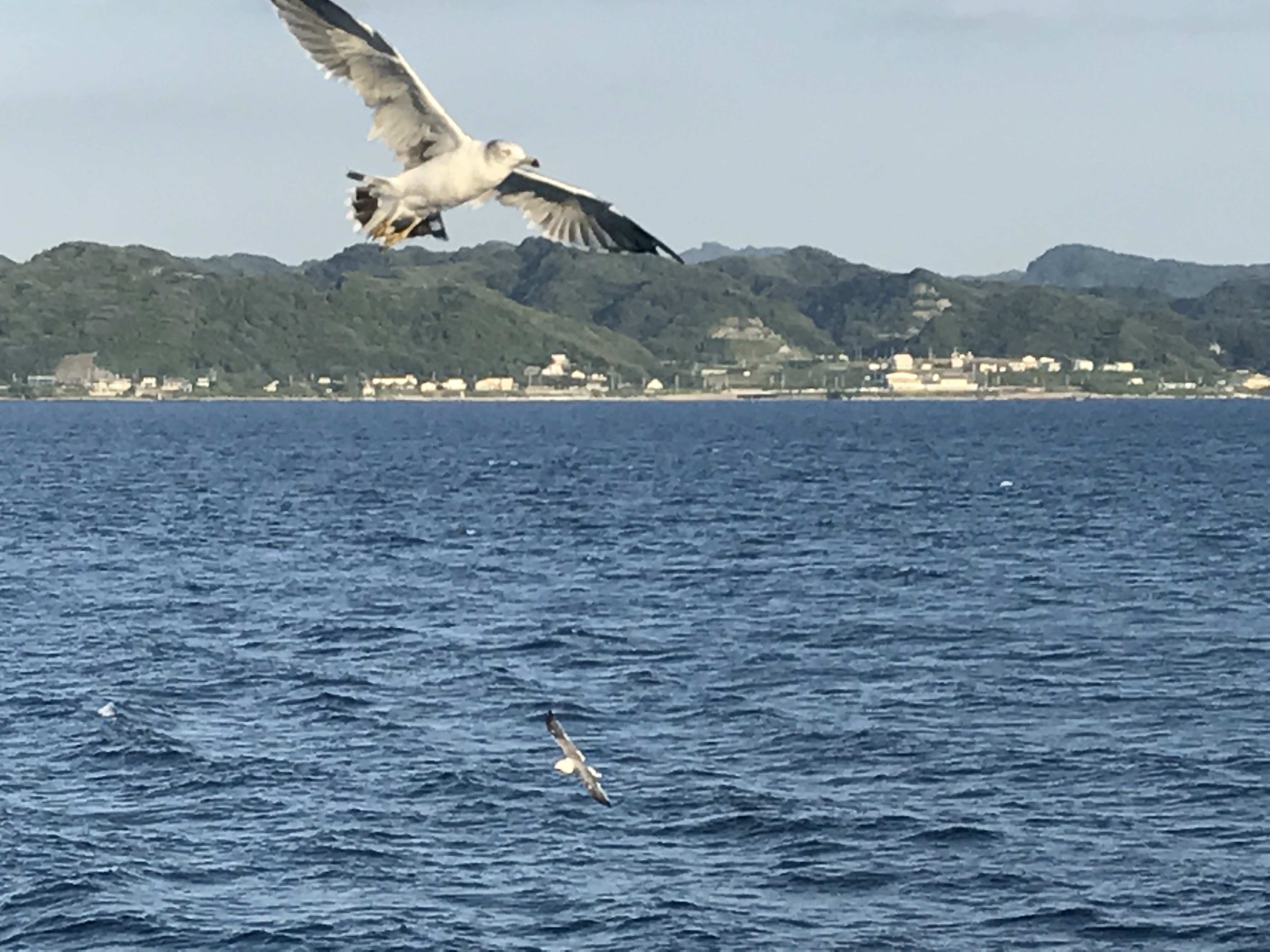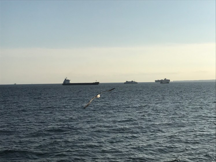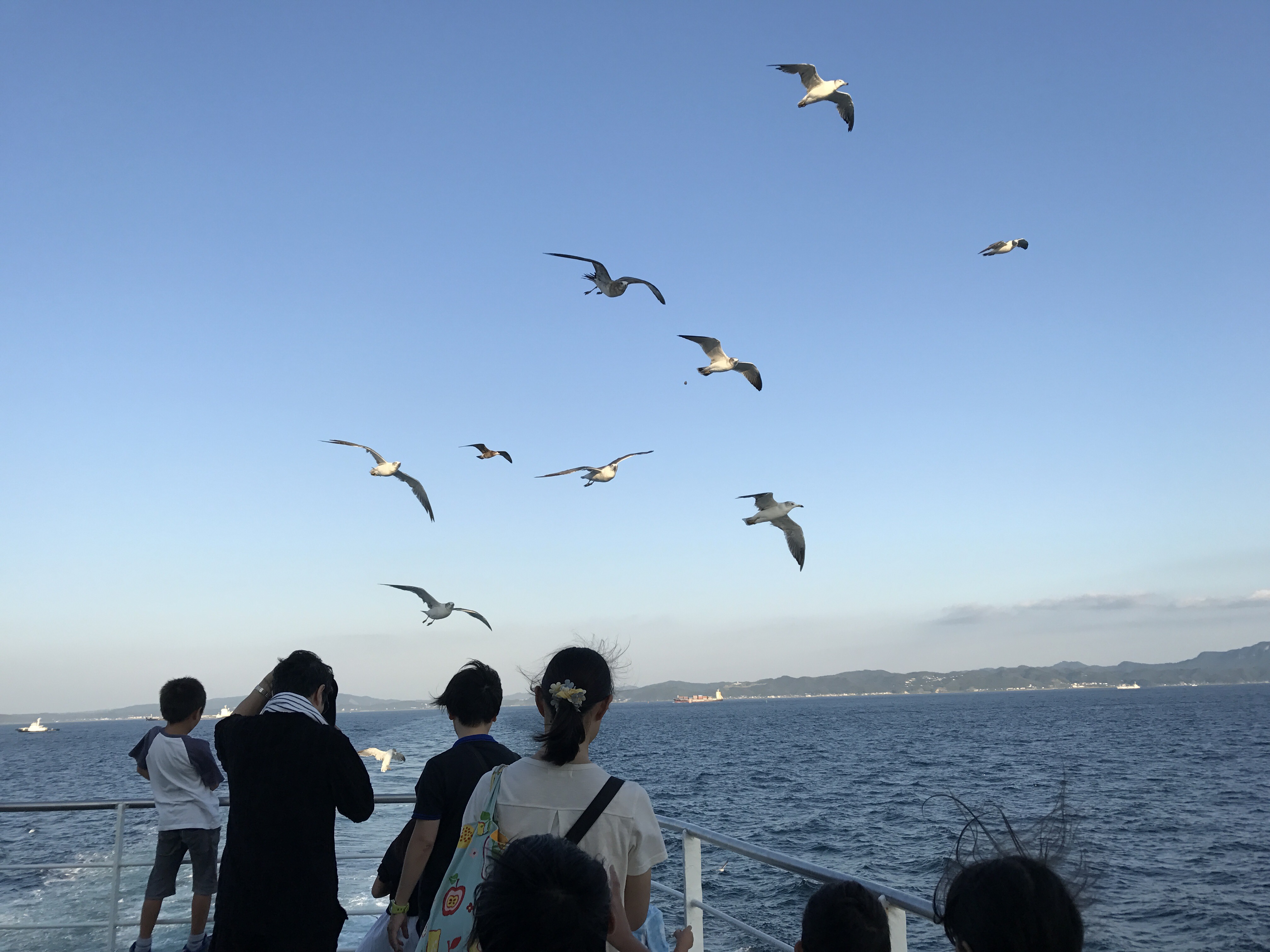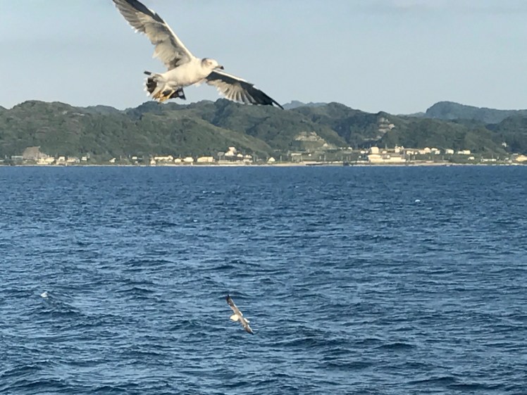 船が出発すると東京湾を行き交う大きな船が沢山通り、また、カモメが寄ってきます。