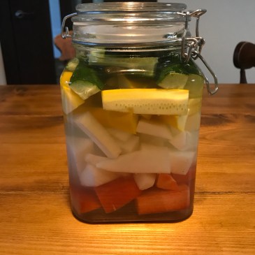 立派な大根とフルーツキャロット紅人参なるものが手に入ったのでキュウリと黄ズッキーニでピクルス作り。 漬け汁はミツカン簡単酢レモン風味一本と柚子シロップ少々。 手抜きですが野菜が新鮮なので美味しく出来上がります。 因みにこ … 続きを読む : ピクルス