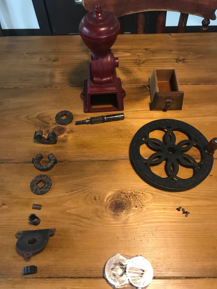 気に入って使っているのですが、最近、挽いた粉の粒が最高に小さくしても若干大きい気がして、分解清掃と合わせ歯を新品に交換することに。歯は館山の珈琲豆店ポラリスさんにメーカーから取り寄せてもらいました。何の説明書もないので後で組み立てが出来なくならないように分解した部品を順番通りに仮置き。