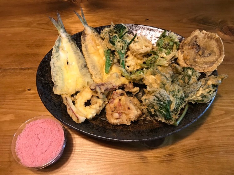 衣が濃かったのか、見栄えは今ひとつでしたが、蕗の薹やなばな、明日葉、スティックセニョール、プチベール、アイスプラントも美味しい!ジャンボ黒ニンニクもいけました。味付けは、おつゆとピンク色の梅塩を用意。美味しく食べるには眼の前で揚げながら、揚げたてがいいですね。これからも天ぷら、極めてみたいですw。
