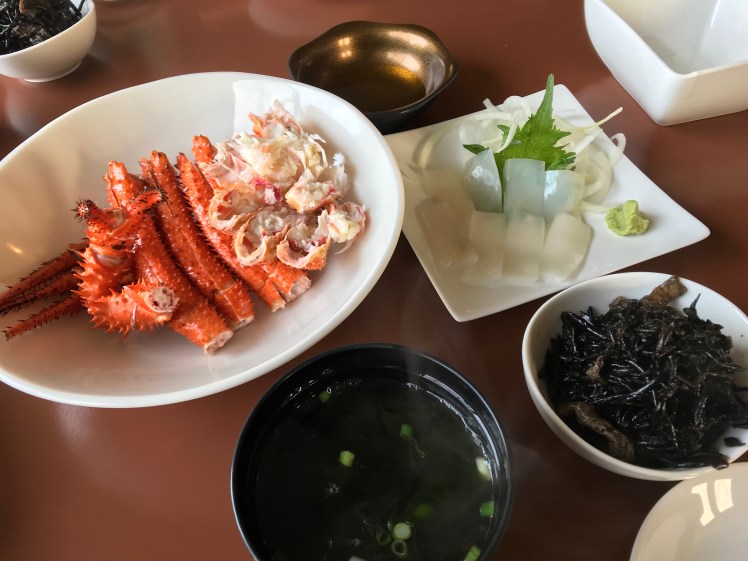 買出しの後はランチで荒崎の「あらさき亭」へ。目の前の漁港で上がった新鮮な魚介を使ってランチを出してくれます。オーダーしたのは荒崎ガニとヤリイカの刺身の定食とホウボウの煮付け定食。