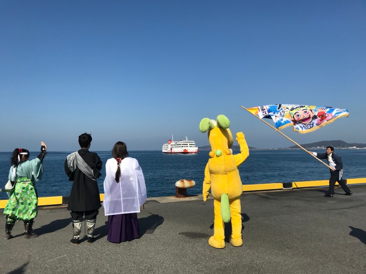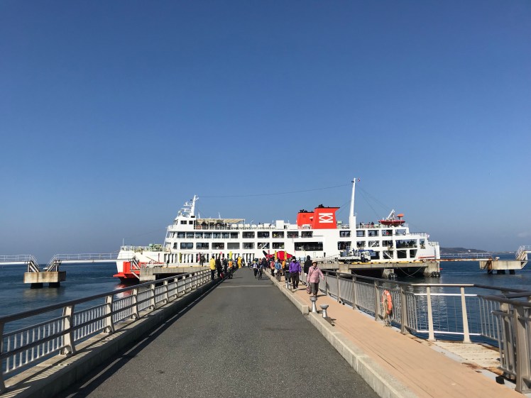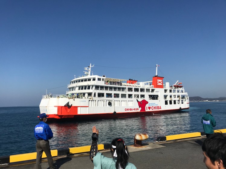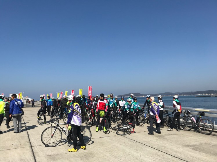 船が到着してサイクリストたちが下船。館山市長も来て歓迎。