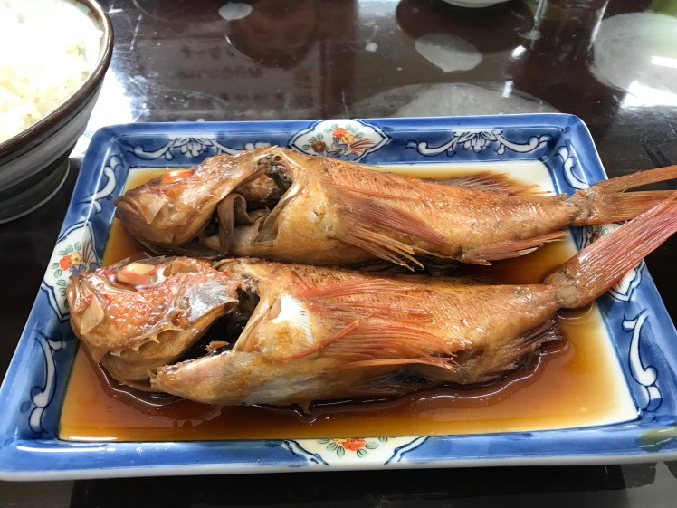 途中、白浜でランチ。自分はカサゴの煮魚定食を。