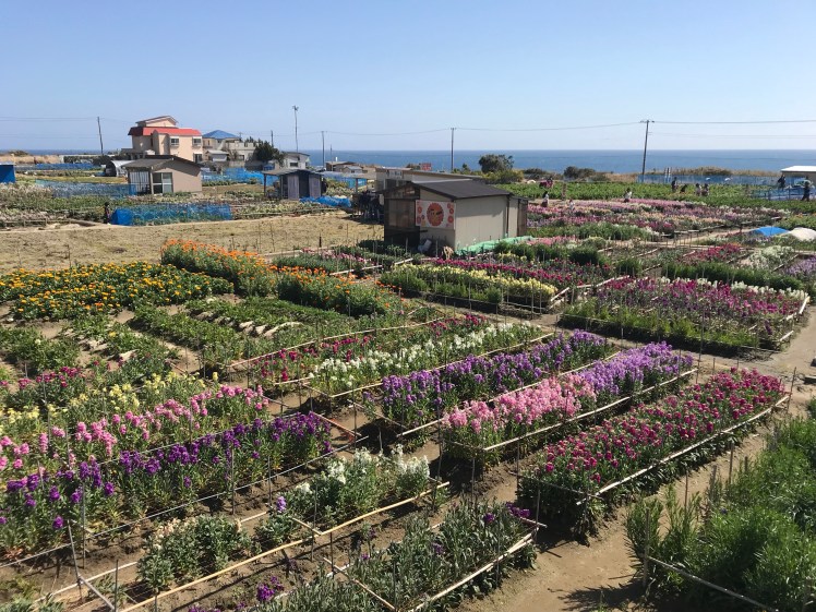 風が強いので海岸線から一本内陸入った房総フラワーラインを千倉方面へ走っていると花摘み畑が賑わっていました。
