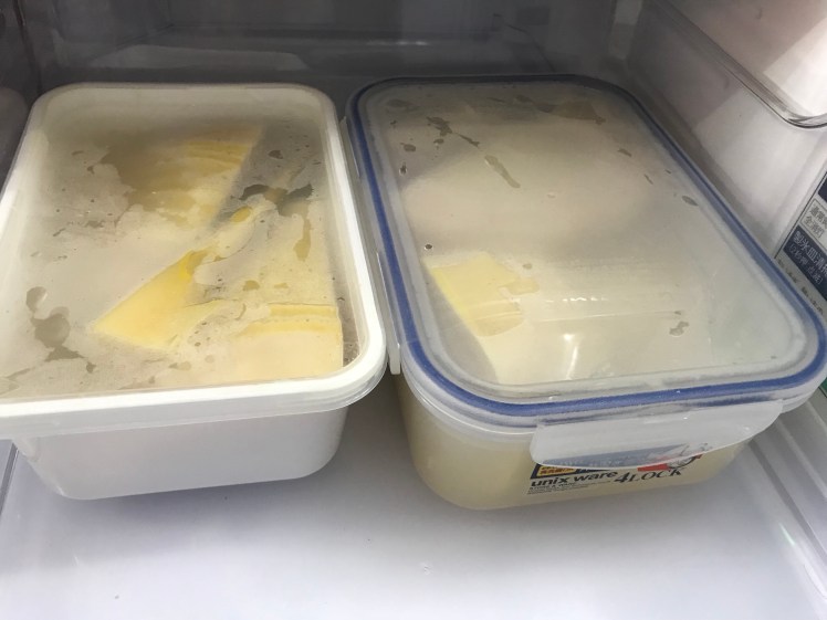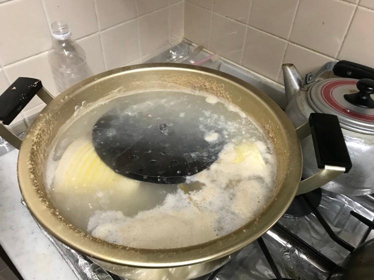 皮をむき、アク取り。生まれて初めての作業です。親切に袋に入っていた糠(ぬか)と家にあった唐辛子を入れて煮ます。