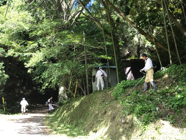 今日は村の人たちが集まって草刈り他、風早不動尊周辺を綺麗にする日。私はいいよと言われているのですが、このお不動さん、私の家が一番近く、その前の道も私が一番良く通るので皆さんに綺麗にしてもらうのは申し訳なく思ってて、先日たまたまこの日を教えてもらったので参加することにし、昨夜そのために館山に来ました。朝9時に集合と聞いていましたが、いつも皆集まるのが早いので15分前に行くと全員揃ってて早速作業開始。私も刈り払い機を肩に下げて参戦。お不動さんの敷地や近くの駐車場、付近の荒れた道路を草を刈ったり雑草抜いたり、枯れ枝や落ち葉を掃いて片付けたりと皆で綺麗にします。