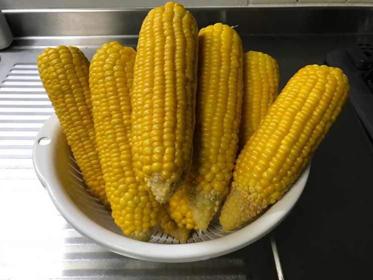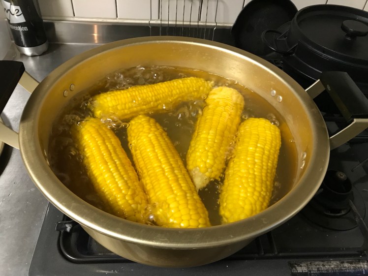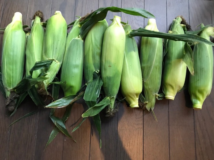 館山のトウモロコシは甘くて有名。今が旬です。全部で10本。早速、大鍋で5本ずつ茹でました。トウモロコシは食べる時に茹でるのでなく、収穫後、出来るだけ早く茹でてしまうことが大事。北海道では常識ですw。