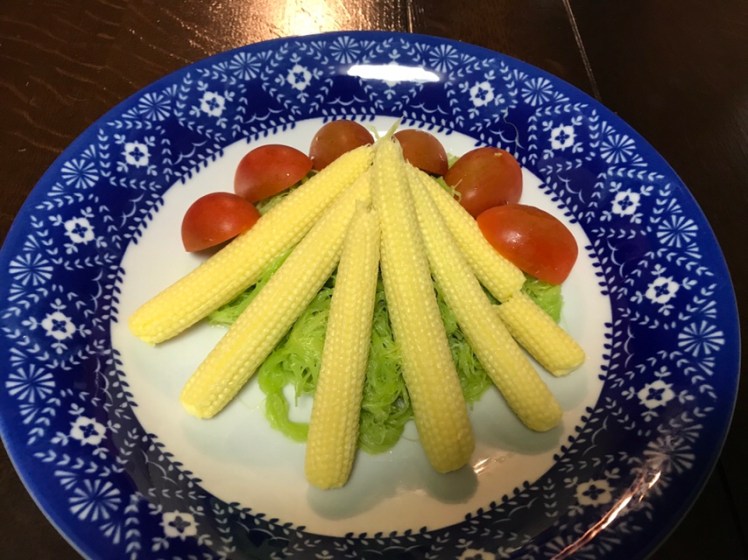 茹で上がったらオリーブ油とお塩を掛け軽く茹でたコーンと一緒に盛り付け。