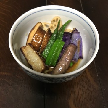 野菜を買うといつも味噌炒めばかり。今日は夏らしく揚げ浸しに挑戦。と言っても、簡単です。 材料は地場のひもナス、しいたけ、オクラ、レンコン。 これらを切って小さいお鍋で少なめの油で揚げ、麺つゆにつけて出来上がり。 何か一工 … 続きを読む : 夏野菜の揚げ浸し