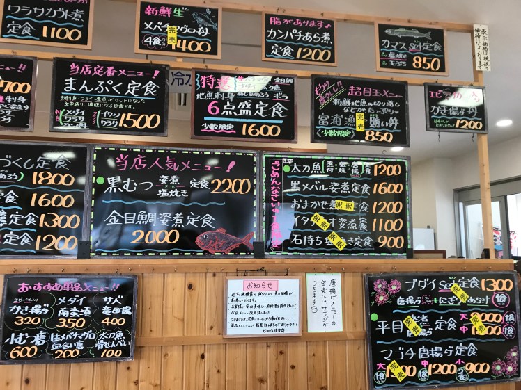15分ほどで席に付けました。しかしこの日は朝、波が高かったため、水揚げされた魚が少なかったようで多くのメニューが既に完売状態となっていました。