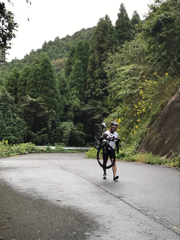 そして本日のハイライトとなる佐久間ダム近くの坂道へ。はじめだらだら、徐々に傾斜がきつくなる精神的にもタフなコースです。ところが中盤過ぎた頃、自分のチェーンが外れてインナーのギアとスポークの間に食い込んでしまい、手が油で真っ黒になりながら色々手を尽くすも治りません。そこで比較的近くにあるサイクルツーリズム協会さんが運営する平群のクラブハウスの知人に電話。そこのスタッフの方が車でレスキューに来てくれて、クラブハウスに戻り直して頂きました。