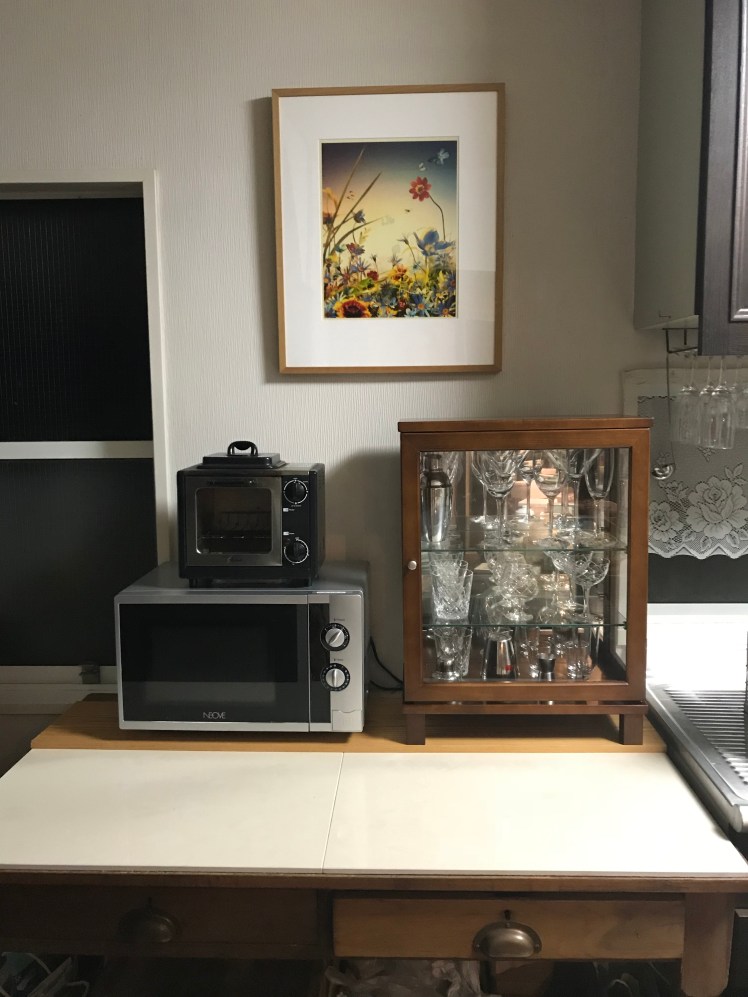 カクテルやウィスキー用のグラス、和室にある食器棚にしまっていましたが、いちいち隣の部屋まで行くのが面倒だと思っていたところ、ホームセンターでコレクションケースとして売られていたものでちょうど良いサイズの棚が目に留まり、購入して整理しました。