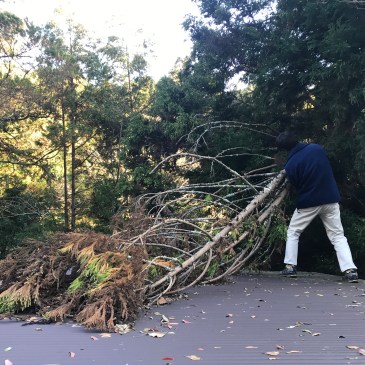 先週、杉の大きな枝 が倒れて物置きの屋根に載っかっているのに気づき、この土曜日、友人にも手伝ってもらいながら取り除くことに。倒れたのは台風24号の時と思われます。 枝の根元が未だ幹に付いているため、取り敢えず手の届くとこ … 続きを読む : 台風24号の後遺症