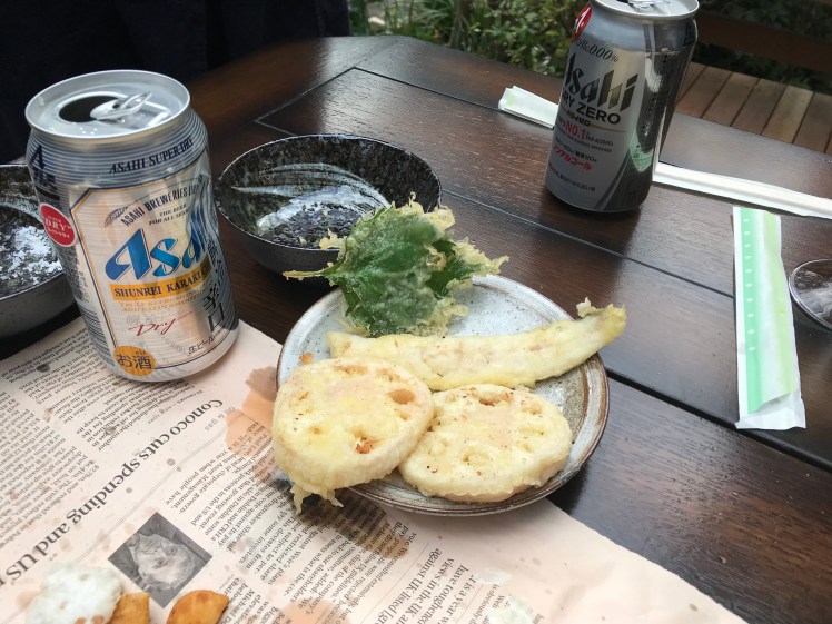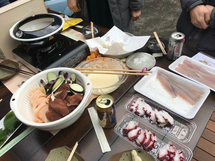 寒くなりましたが陽も照ってきたので最初はベランダで先ずは天ぷら。ムツとカマスを魚屋さんで3枚に下ろしてもらい、野菜は蓮根、椎茸、茄子、大葉など。