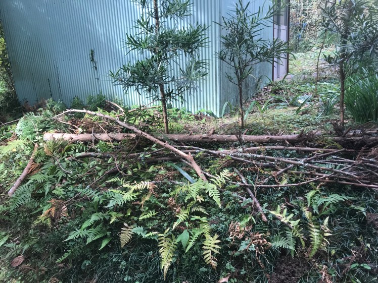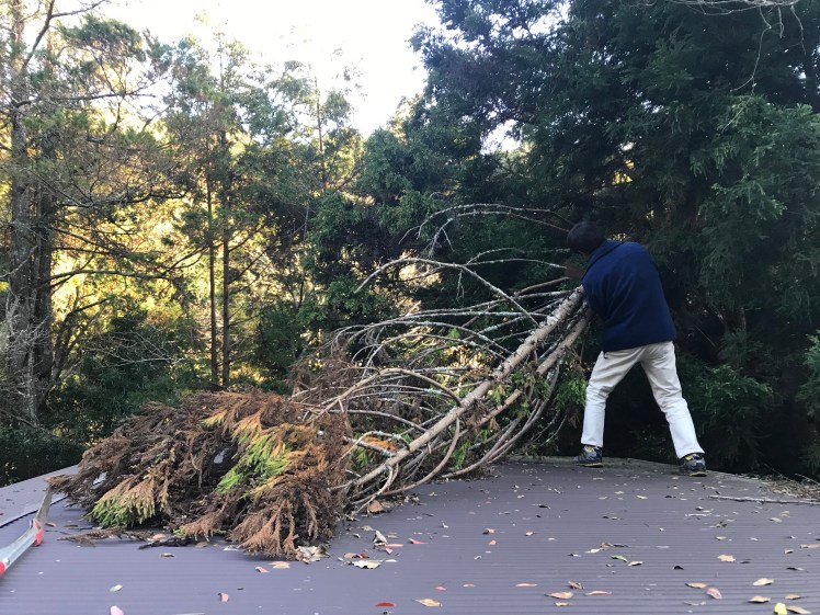 先週、杉の大きな枝 が倒れて物置きの屋根に載っかっているのに気づき、この土曜日、友人にも手伝ってもらいながら取り除くことに。倒れたのは台風24号の時と思われます。