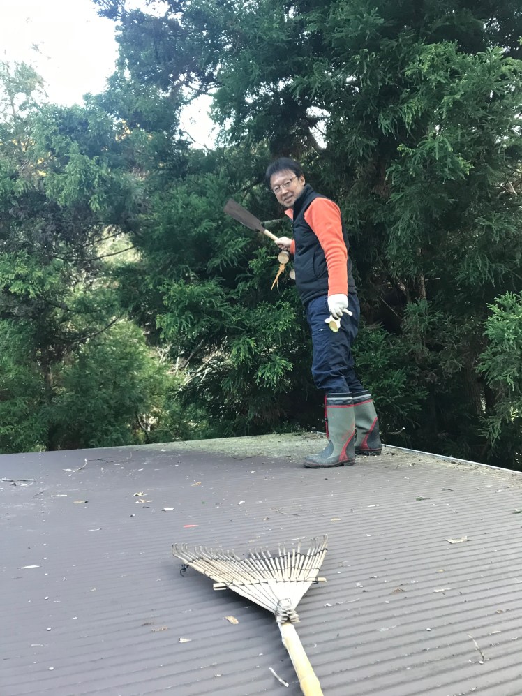 枝の根元が未だ幹に付いているため、取り敢えず手の届くところで切り落とすことに。屋根の上に溜まった枯葉や雨樋に詰まっていた腐葉土を綺麗にしてスッキリ。