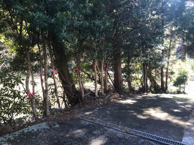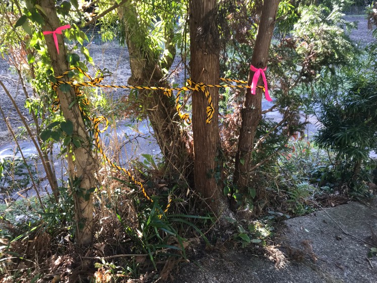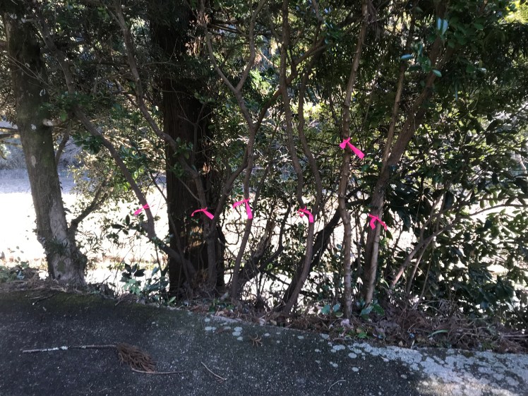 道路にはみ出したり、木と木が交錯したり、電話と電気の引込み線に絡んだり。大手術をすることとし昨日、お庭の専門家に来てもらって相談しながら取り敢えず、伐採する木をリボンで印付け。