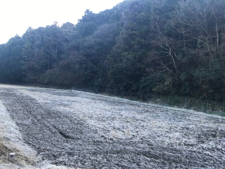 南房総は冬も一般的に暖かいと言われていますが、冬の朝は放射冷却現象だと思いますが、都心より気温が下がることがあります。今朝、起きて外を見ると家の前のたんぼが真っ白に。霜が降りていました。