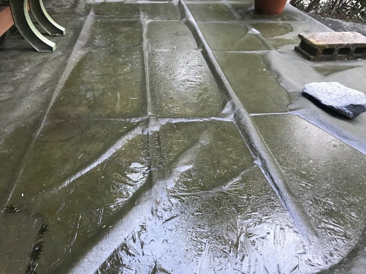 家のデッキのカバーに溜まった水も氷が張っていました。