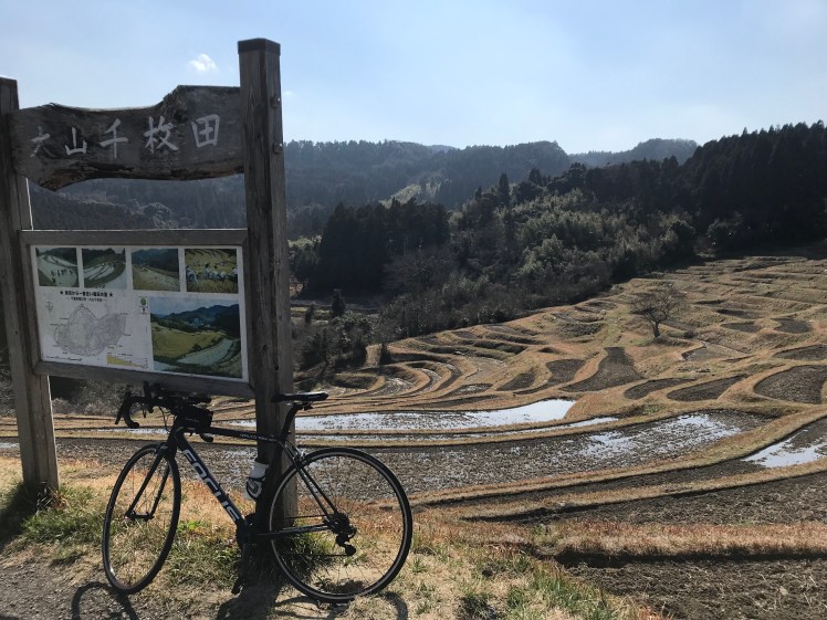 昨日の土曜日はトライアスロン仲間の合宿1日目でバイク練習。寒さも少し和らぎ絶好の自転車日和。道の駅「富楽里とみやま」に10時半に集合して出発。今回はドイツ人のクリスも参加してちょっとインターナショナルな感じ。コースは山を中心に約100km。結構なアップダウンを前半に入れました。定番の大山千枚田も。